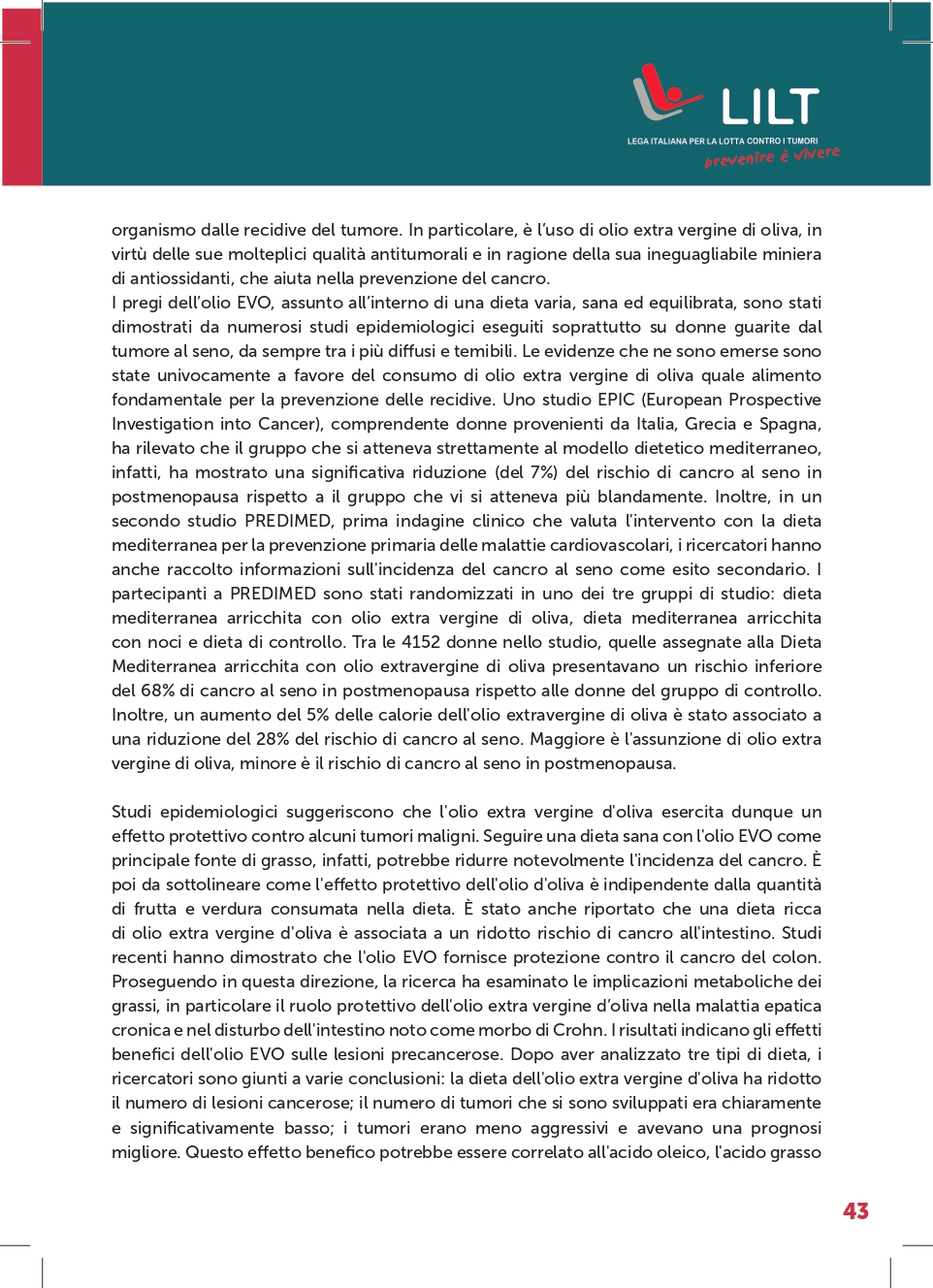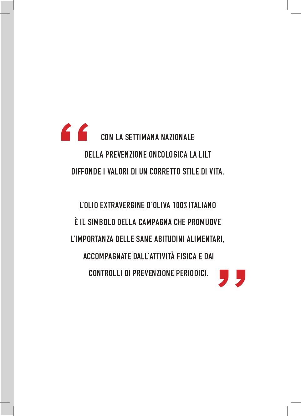 Il simbolo della Settimana per la Prevenzione è – da sempre – l’olio extravergine di oliva 100% italiano, re della dieta mediterranea: eccellenza della tradizione enogastronomica italiana è anche un amico della nostra salute, l’ “oro verde” con accertate caratteristiche nutrizionali ed organolettiche in grado di proteggerci da diversi tipi di tumore.