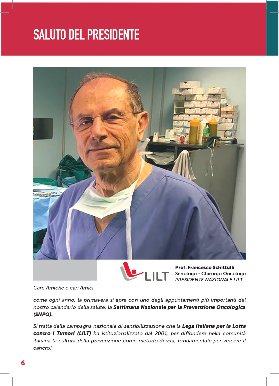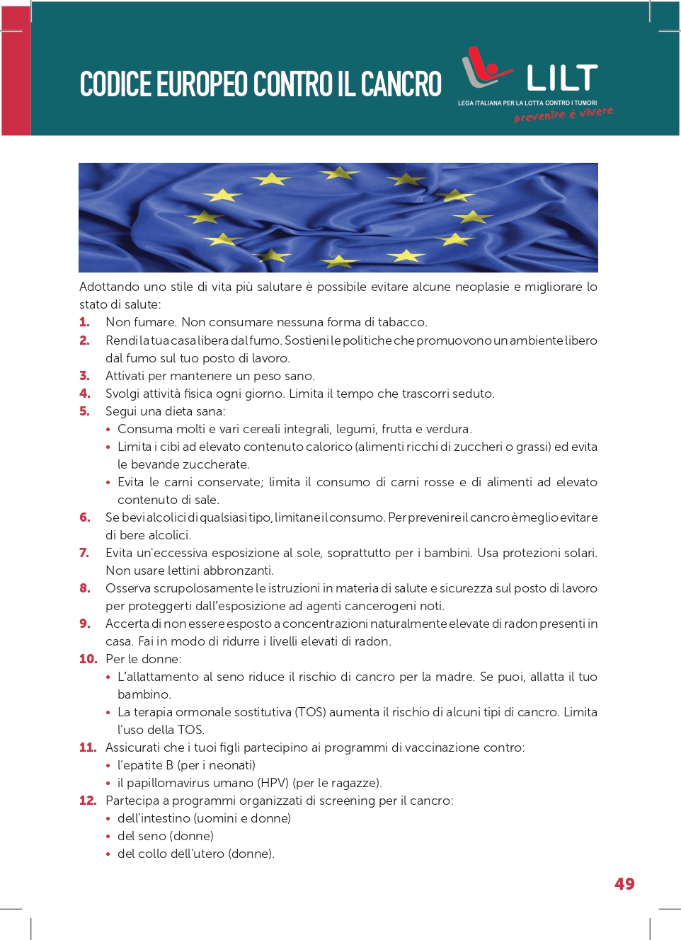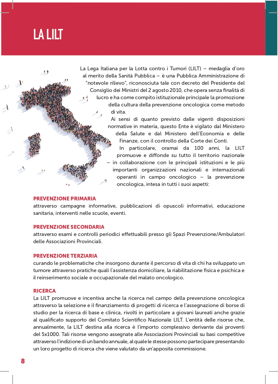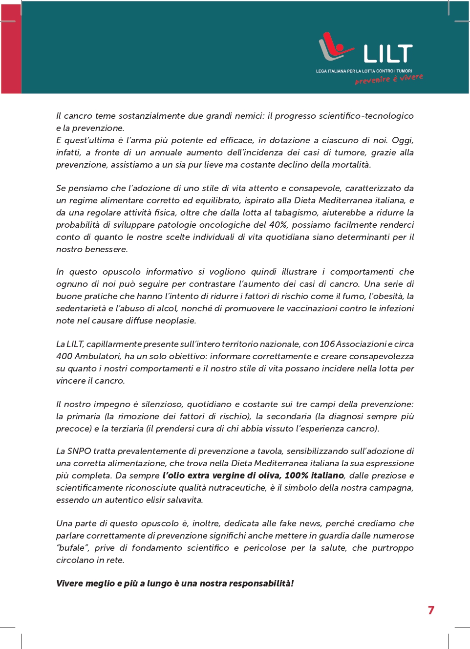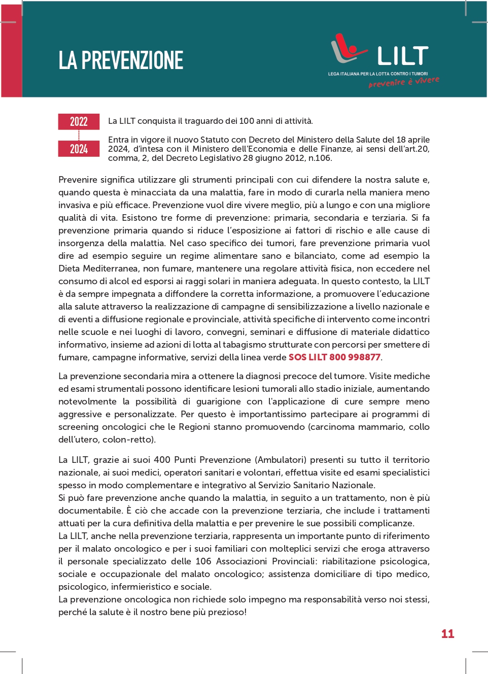 Con l’arrivo della primavera si svolge uno dei principali appuntamenti della LILT: la Campagna della “Settimana Nazionale per la Prevenzione Oncologica”. Tale Campagna, che è stata istituita con Decreto del Presidente del Consiglio nel 2001, ha lo scopo di diffondere la cultura della prevenzione e l’importanza di corretti e sani stili di vita, quali: non fumare, non bere alcolici, alimentarsi adeguatamente nella giusta stagionalità, fare attività fisica per combattere la sedentarietà e tutte le malattie ad essa correlate, riposare, effettuare controlli periodici per la diagnosi precoce.