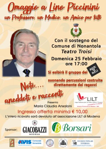 “OMAGGIO A LINO PICCININI, UN PROFESSORE, UN MEDICO, UN AMICO PER TUTTI!“ PER RICORDARE LA FIGURA DEL PROF. LINO PICCININI, MEDICO ONCOLOGO NONANTOLANO IN OCCASIONE DEL TERZO ANNIVERSARIO DALLA SCOMPARSA.