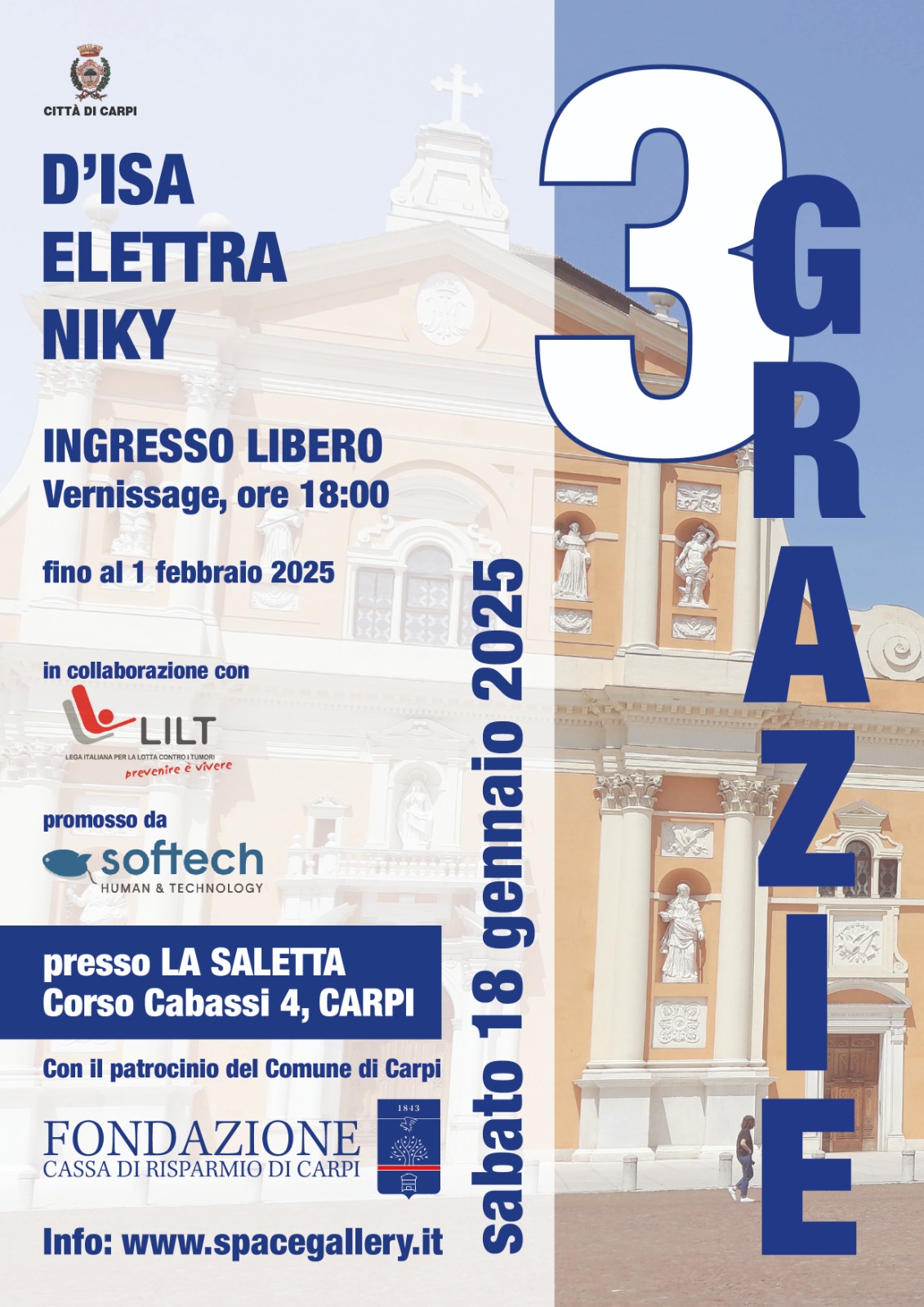 Tre Grazie è un progetto basato sullo scambio culturale ed artistico all’insegna della femminilità, un progetto rosa che vede dialogare le opere di tre artiste europee in un sentiero pittorico, scultoreo e sperimentale. Dove Tre Grazie, oltre ad essere un richiamo alle opere storiche (Canova, Raffaello, Rubens), è anche un invito velato a ringraziare la vita, ringraziala più volte, enfatizzando ogni giorno, dandogli il giusto valore, come un bellissimo regalo.